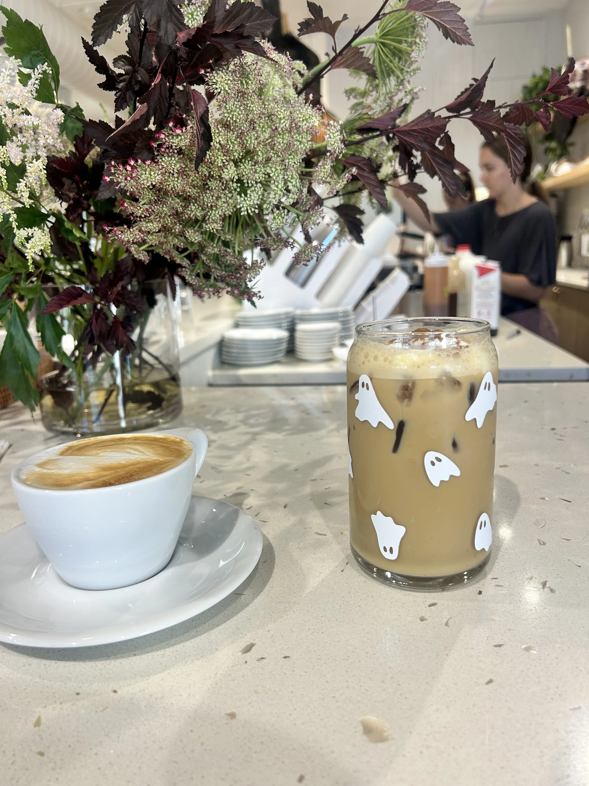 The seasonal glasses give me so much serotonin. Guillermo ordered a hot cappuccino, and I got the Oatmeal Creme Pie latte (decaf) ... it is next level.